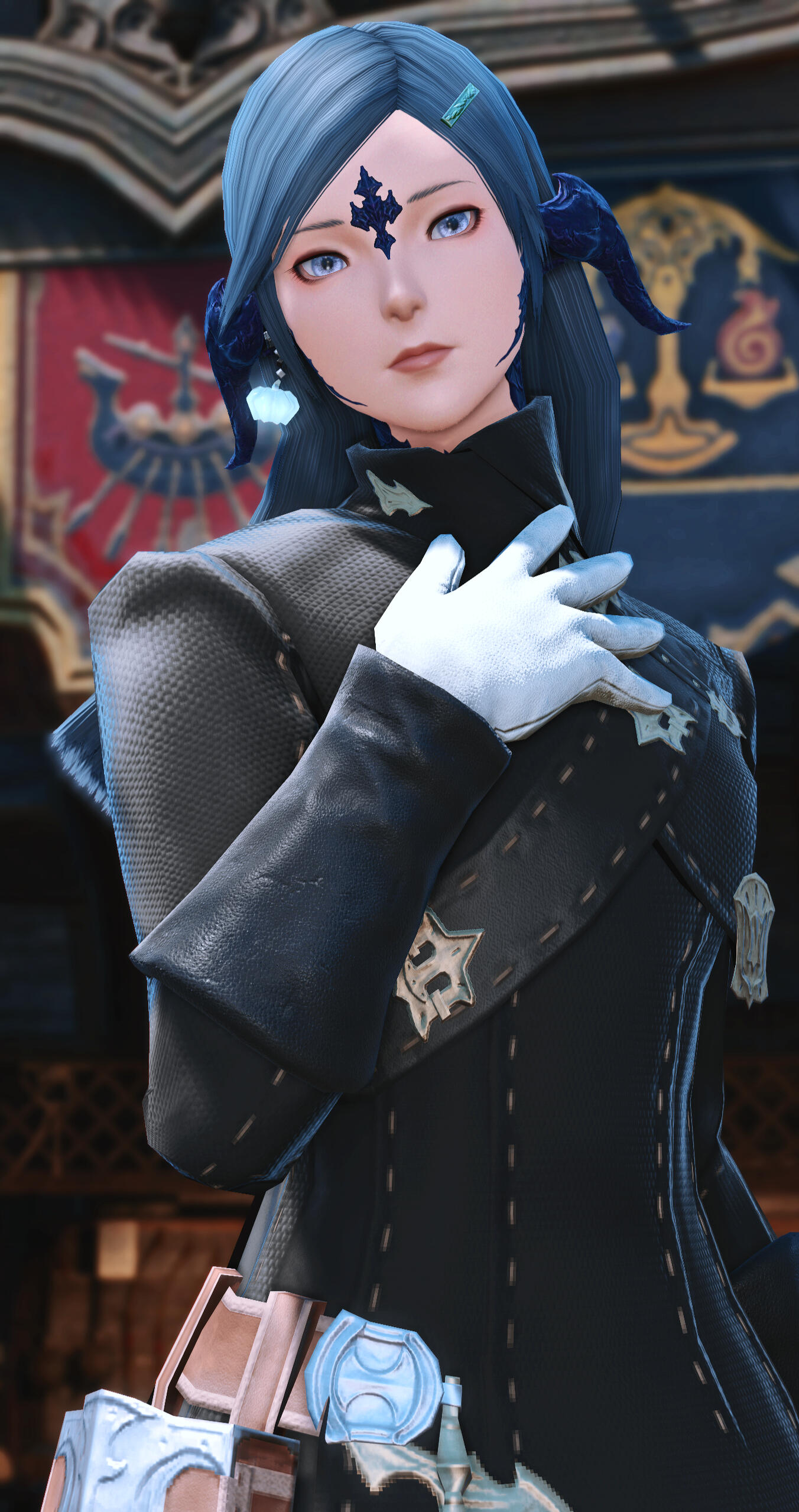 Like her namesake, Aster has lilac eyes and long blue hair neatly kept by a clip. A tall, lean frame following even sharper features. The Au Ra is adorned with dark scales that particularly brush the bridge of her nose.A well-dressed woman, her face seldom betraying carefully crafted composure. Aster carries herself with an air of professionalism as one would expect from her line of work. A glass pumpkin dangles beneath a horn, an eternity ring fits the opposite hand.