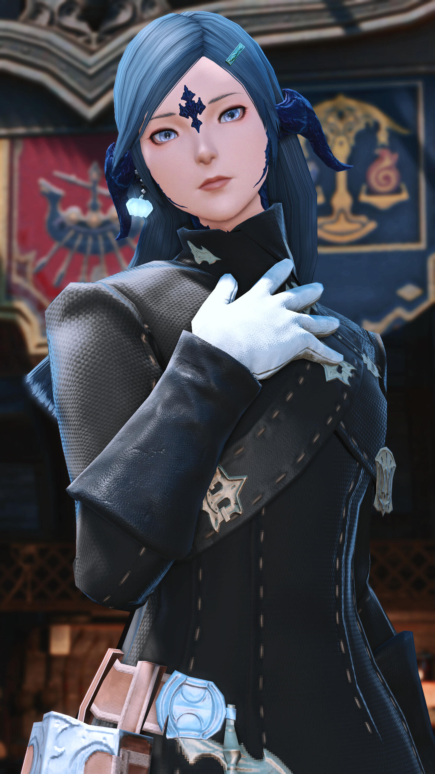 Like her namesake, Aster has lilac eyes and long blue hair neatly kept by a clip. A tall, lean frame following even sharper features. The Au Ra is adorned with dark scales that particularly brush the bridge of her nose.A well-dressed woman, her face seldom betraying carefully crafted composure. Aster carries herself with an air of professionalism as one would expect from her line of work. A glass pumpkin dangles beneath a horn, an eternity ring fits the opposite hand.